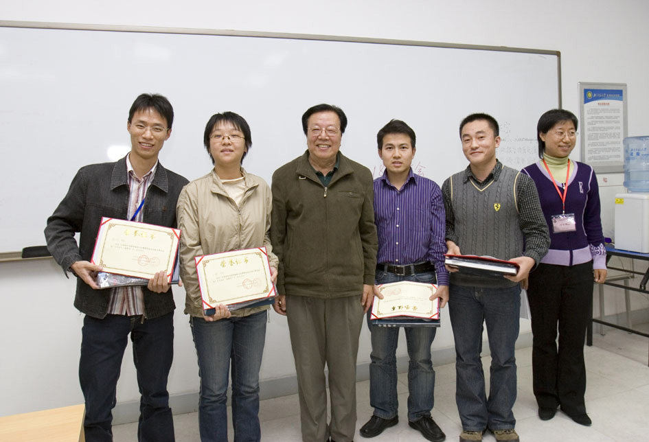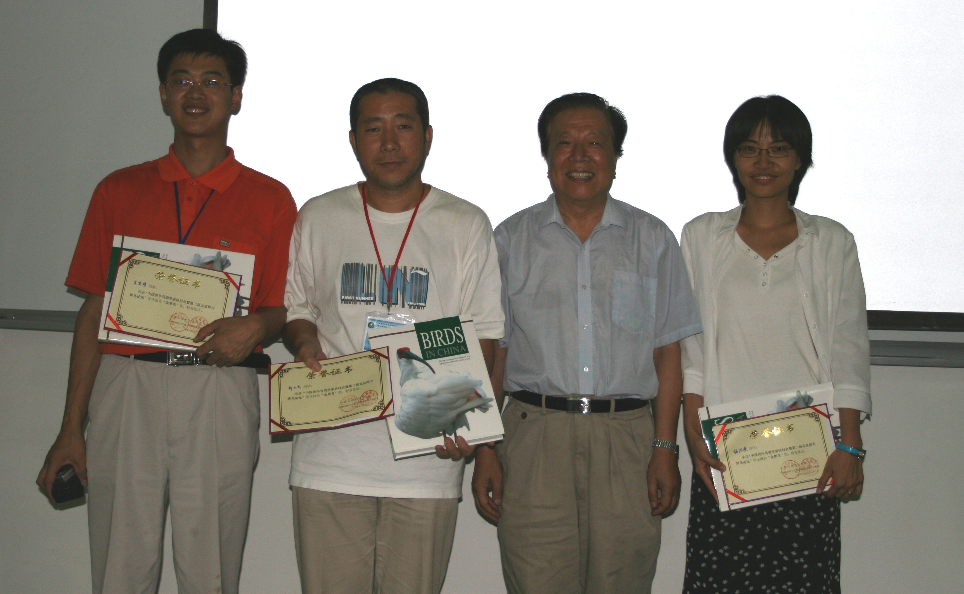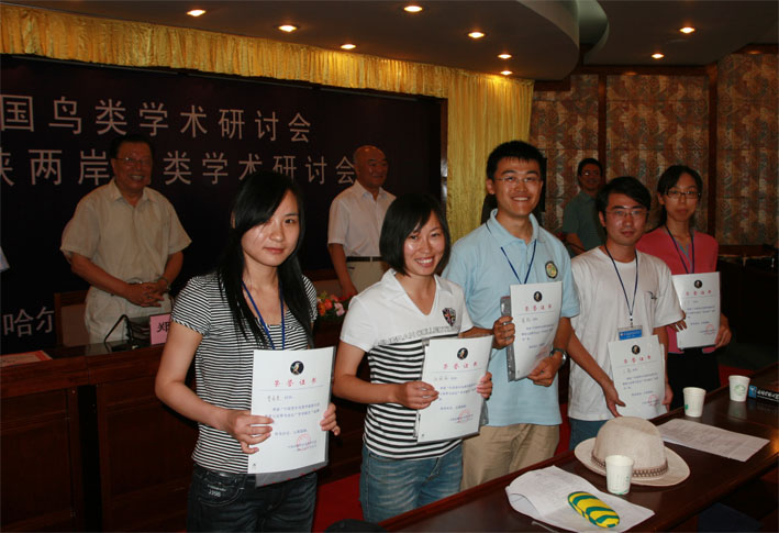 郑光美院士和万冬梅教授为获得金翠鸟奖的同学颁奖后合影 (获奖同学自左向右依次为周大庆、王琛、王杰、惠鑫) -------------------------------------------------------------------------------------------------- 第五届(哈尔滨,2009) 金翠鸟奖: 王宁(北京师范大学) 张微微(东北林业大学) 董路(北京师范大学) 曹曼曼(兰州大学) 王鑫(中国科技大学) 银翠鸟奖: 刘强 曲文慧 斯幸峰 梅玫 秦玉芳 刘颖颖 张宇婷 彭礼华 优秀学术报告奖:夏灿玮 焦盛武 周春发 林芳君