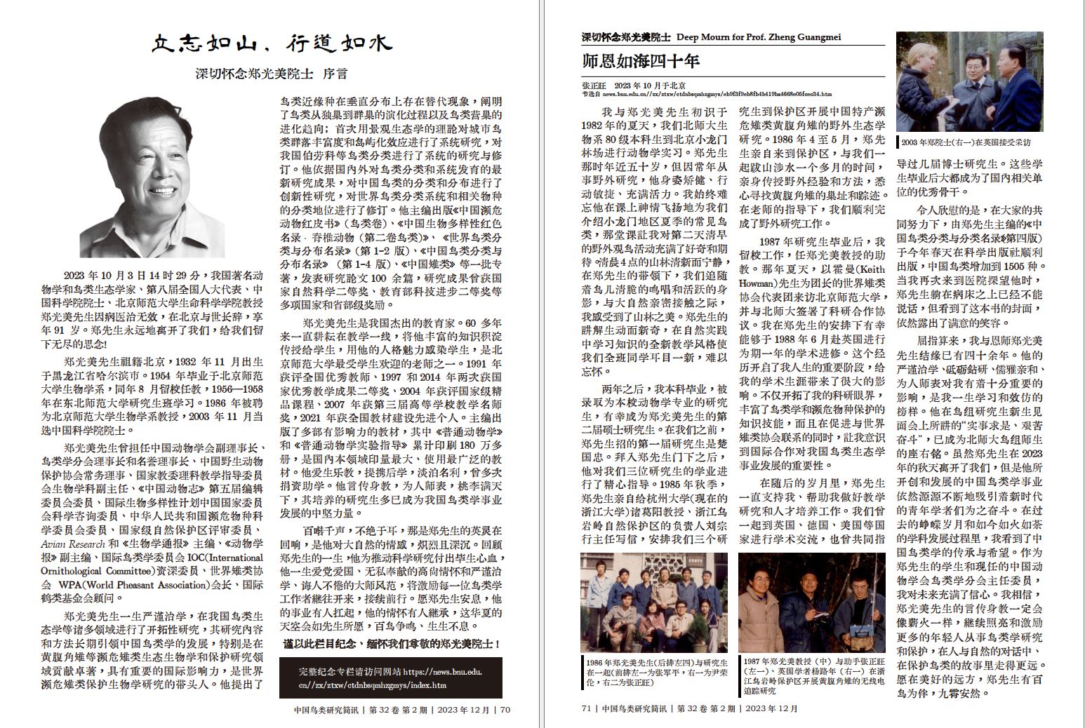 为怀念我国鸟类学引路人之一的郑光美先生,本期《简讯》特别刊出纪念专栏,通过老照片和回忆文章,深切缅怀为我国鸟类学事业做出巨大贡献,为我国鸟类学工作者提供指引的鸟类学先驱。专栏请见本刊67页。