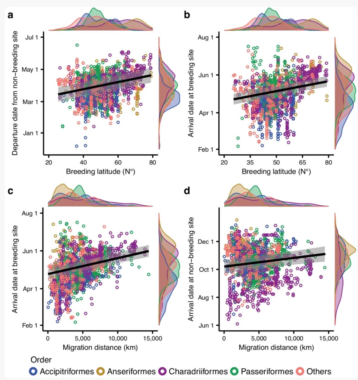 结构方程模型中候鸟关键迁徙时间节点与繁殖地纬度(a-b)和迁徙距离(c-d)的关系。阴影代表95%可信区间。每个圆圈表示1个追踪的个体或者种群。图的上部和右部展示了变量的密度分布。